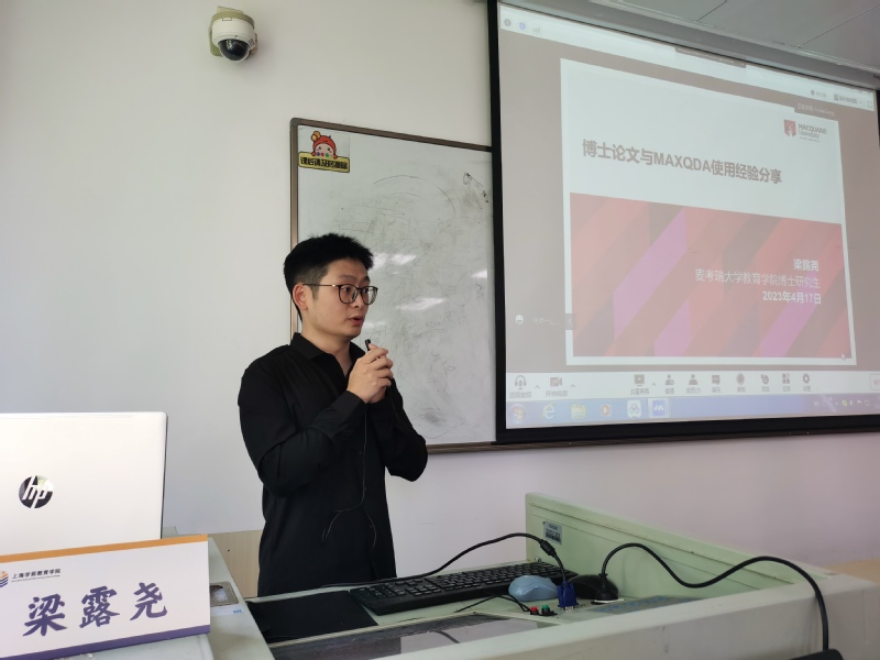 沙龙活动开始后,博士生梁露尧首先进行了自我介绍,并简要介绍了自己的博士论文。他详细阐述了论文的标题、研究背景、研究意义、研究问题、论文结构及论文中的四个子研究等内容,同时分享了MAXQDA这一质性分析软件的使用经验。他指出,MAXQDA具有用户友好、易上手、多系统同步等特点,并实际演示了该软件的基本操作,介绍了菜单栏与界面上四个窗格的作用,强调了代码备忘录、代码本、可视化工具等功能的重要性。