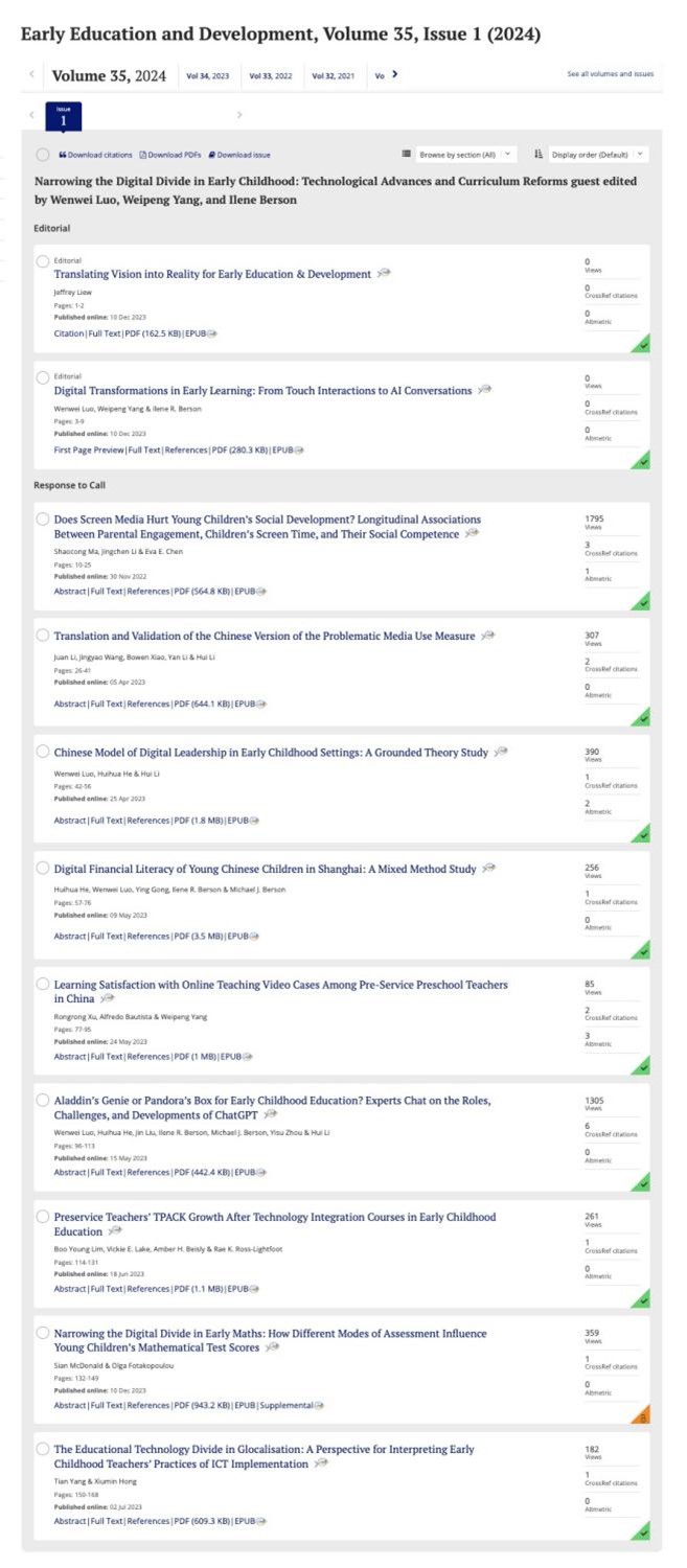由kaiyun体育登录网页入口“学前教育数字化转型研究中心”的罗文蔚副教授担任客座编辑的SSCI二区期刊《Early Education and Development》的专刊,聚焦于“缩小幼儿教育中的数字鸿沟:技术进步与课程改革”。罗文蔚副教授还撰写了题为“幼儿教育数字化转型:从触摸互动到人工智能对话”的卷首语。该专刊探讨“技术与幼儿教育融合”的主题,包含9篇经过同行审议的文章,分为5个主题。专刊已于2023年12月在线发布,2024年1月将出版纸质版。