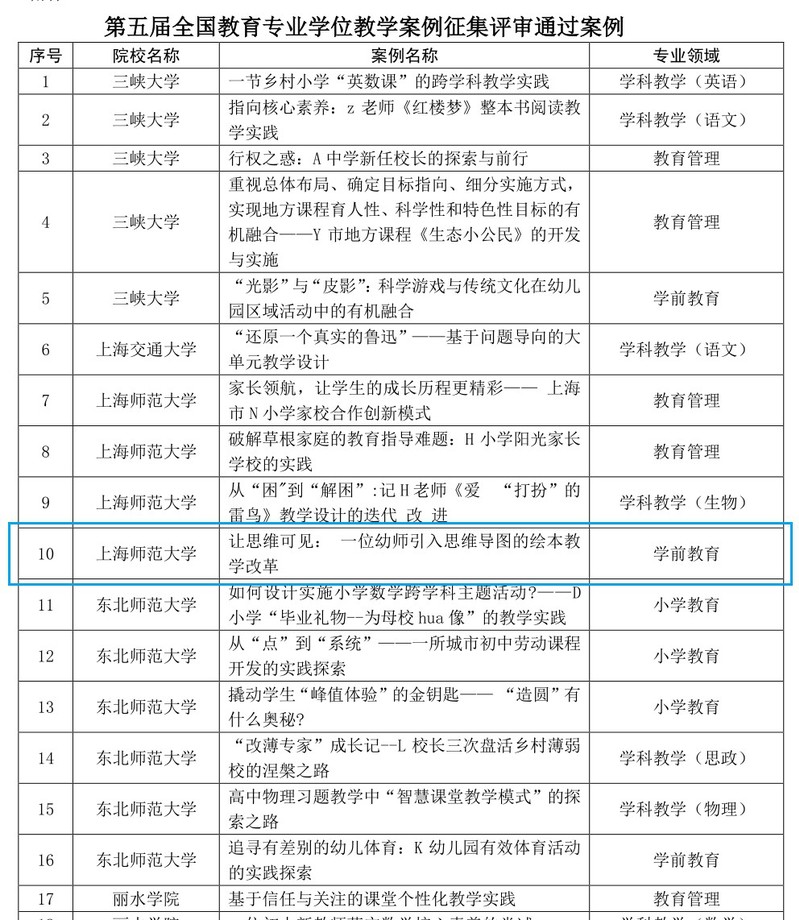 近日,全国教育专业学位研究生教育指导委员会秘书处公布了第五届教育专业学位教学案例征集工作评审结果,我院王海澜副教授的教学案例《让思维可见:一位幼师引入思维导图的绘本教学改革》再次入选。