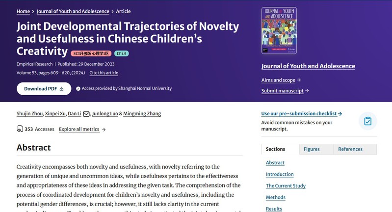 我院师资博士后周淑金老师在JOURNAL OF YOUTH AND ADOLESCENCE期刊的2024年第53卷上发表研究论文“Joint Developmental Trajectories of Novelty and Usefulness in Chinese Children’s Creativity”。该研究从小学儿童创造力“四年级下降”现象出发,聚焦于创造力的新颖性与适用性两个指标,采用平行潜在类别增长模型探究儿童创造力的发展轨迹。研究结果表明儿童创造力的发展受到包括新颖性和实用性在内的多方面模式的影响。此外,在中国儿童创造力发展的背景下,研究并讨论了轨迹群体成员的性别差异。该研究获得上海市哲学社会科学基金的支持。JOURNAL OF YOUTH AND ADOLESCENCE期刊位于中国科学院文献情报中心期刊分区心理学大类的一区,SSCI数据库心理学学科的一区。