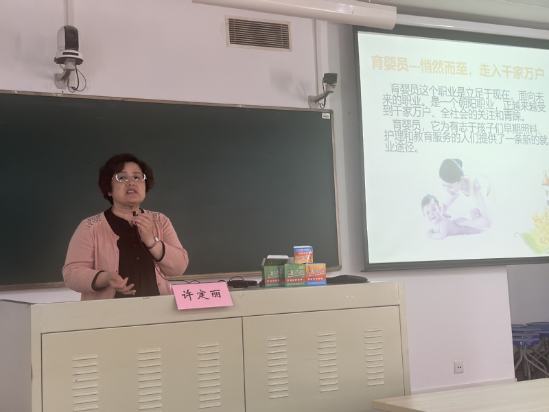 许定丽从就业方向、职业优势、培训课程等方面向同学们介绍了报考育婴师的相关情况,并指出育婴师资格证书在上海市托幼一体化教育背景下的重要性,是越来越多幼儿园教师正在努力的方向。