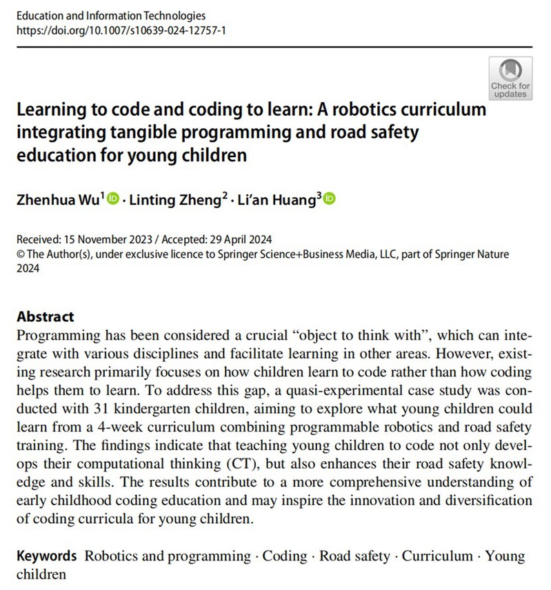近日,我院黄立安副教授(通讯作者)与教育学院吴振华副教授团队合作撰写的论文“Learning to code and coding to learn: A robotics curriculum integrating tangible programming and road safety education for young children”发表于Education and Information Technologies(EAIT),该期刊是国际上认可度较高的学术期刊,JCR分区Q1,影响因子为5.5。该期刊提供了一个讨论信息技术与教育交叉领域问题的平台,探讨如何利用计算机改善各种环境、平台和环境中的教育与学习,鼓励从不同研究范式和学习理论的各个层面对基本问题进行讨论。EAIT是国际信息处理联合会(IFIP)教育技术委员会与联合国教科文组织合作出版的官方期刊。