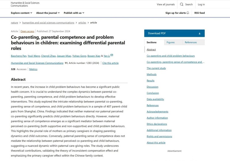 近日,我校李燕教授科研团队在家庭教育研究方面取得重要进展,研究成果以“Co-parenting, parental competence and problem behaviours in children: examining differential parental roles”为题,成功发表于《Humanities & Social Sciences Communications》(人文社会科学通讯)期刊。该论文上海师范大学为第一署名单位,2023级博士生潘宝城、2024级博士生王由丽为论文共同第一作者,作者还有2022级kaiyun体育登录网页入口硕士研究生赵成丽、苗家璇,2022级退役军人学院龚奕肇,kaiyun体育登录网页入口博士后肖博文,李燕教授为论文通讯作者。