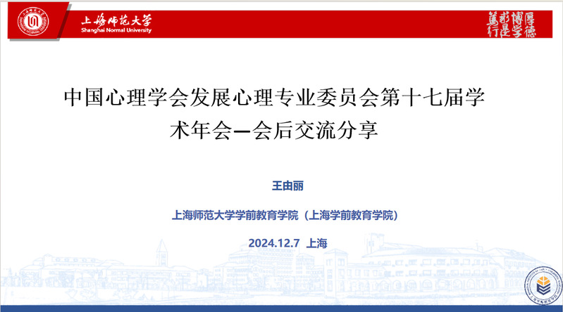 学院师生到达杭师大后参加了3个会前工作坊,听取了13场大会报告。孙娟娟老师担任《多孩家庭父母养育、同胞关系与儿童心理健康》专题报告的主持人,并做了题为《消极情绪性对幼儿孤独感的影响:独处偏好的中介和是否独生子女的调节作用》的汇报。学院博硕士学生作为报告人在硕博分论坛进行汇报。其中博士生张警辉和硕士生张晴分别做了题为《母亲教养压力、母子关系与学前儿童问题性媒介使用的发展级联效应:一项纵向研究》《父母手机成瘾、低头行为与学前儿童问题性媒介使用:一项纵向研究》的汇报;博士生王由丽做了题为《父子关系与师幼关系对儿童心理健康的双重保护:基于多项式曲面拟合技术》的汇报;博士生曹思敏、潘宝城做了题为《家庭社会经济地位对幼儿早期数字素养发展的影响机制》《父母童年无效家庭经历、协同教养和儿童问题行为的关系:基于共同命运中介混合模型》的汇报。