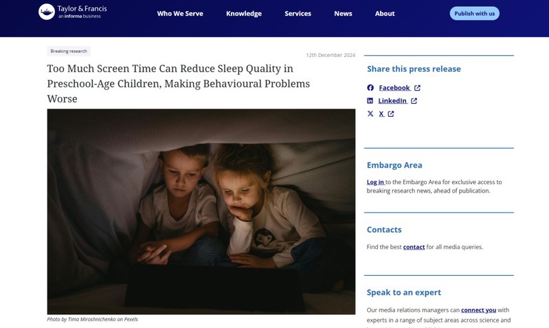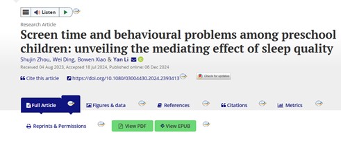 近日,由学院李燕教授领衔的研究团队,在国际知名期刊《Early Child Development and Care》发表了最新研究成果。该成果还作为新闻稿发布于Taylor & Francis Group新闻室(https://newsroom.taylorandfrancisgroup.com/too-much-screen-time-can-reduce-sleep-quality-in-preschool-age-children-making-behavioural-problems-worse/),Taylor & Francis Group新闻室是一个在全球范围内具有重要影响力的学术传播平台,以其丰富的学术资源、数字化出版和对学术可持续发展的贡献而受到高度评价。这项研究不仅揭示了屏幕时间与学龄前儿童睡眠质量及行为问题之间的密切联系,更突显了我院学者在儿童早期发展领域的学术影响力和国际认可度。