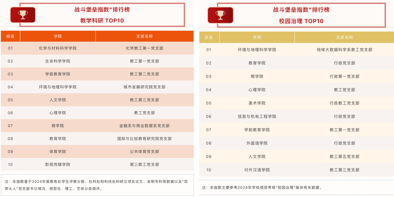 在此次排行榜中,学院教工第二党支部在“教学科研TOP10”榜单中位列第三,充分展现了在教学科研方面的实力与贡献;教工第一党支部在“校园治理TOP10”榜单中位居第七,彰显了在校园治理工作中的作为与成效。