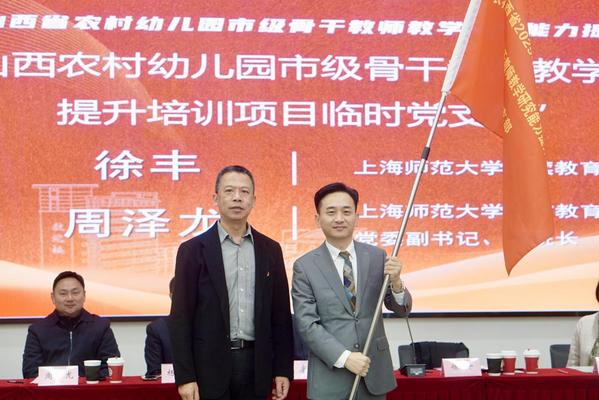 为加强培训期间的思想引领与组织保障,培训期间不仅组建了班级班委,还成立了“山西农村幼儿园市级骨干教师教学研究能力提升培训项目临时党支部”。徐丰为“临时党支部”授旗,勉励党员教师发挥先锋模范作用,带动全体学员共同进步。