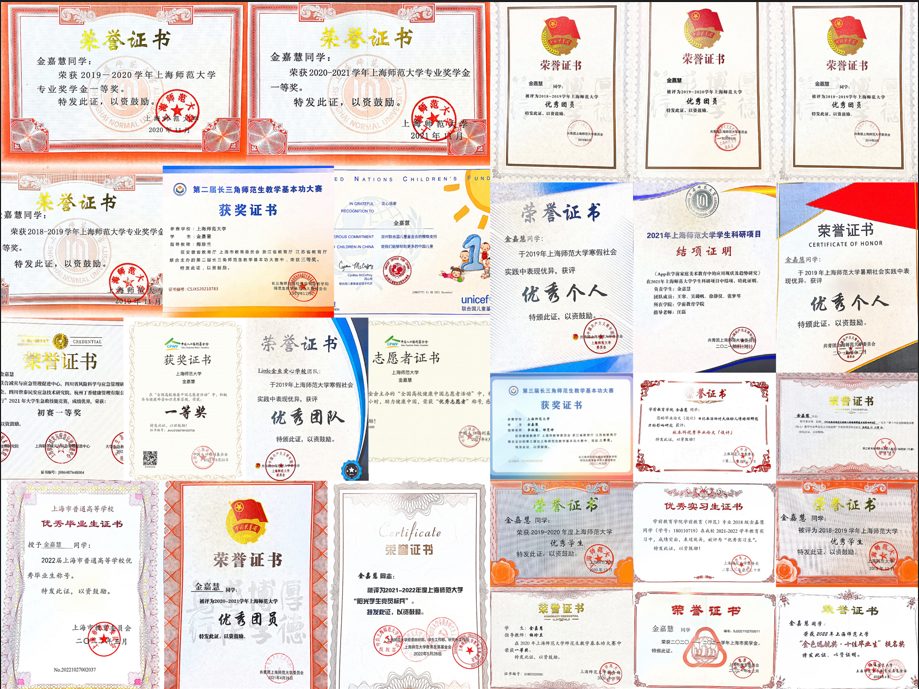 学高为师,身正为范,身在学前教育专业的金嘉慧深深知道,教师承载着接续奋斗的使命,亦肩负着立德树人的担当。为此她勤勉自励,力求成为理论功底扎实,专业技能突出的师范生,不仅多次被评为专业一等奖学金,先后5次在长三角及上海市师范生技能大赛中斩获各类奖项,更获得上海市奖学金,上海市优秀毕业生,十佳毕业生提名等荣誉,并以院系排名第一获得研究生推免资格。