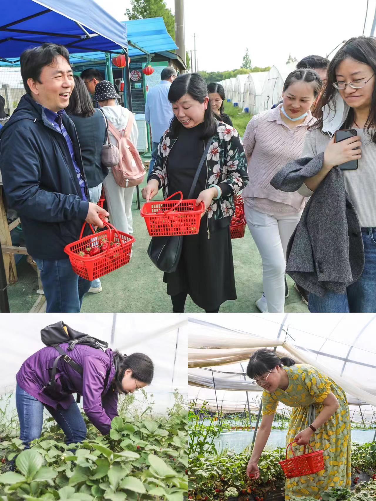 在古镇享用完午餐后,大家一同前往田园农庄采摘果蔬。大棚内绿意盈盈,成片的藤蔓缀满鲜红的草莓,各色番茄挂满枝头,蔬果的香气扑面而来。大家有赏有玩,现场欢声笑语不断,没过多久,每个人手中的篮子里就装满了新鲜的番茄、草莓。最后,大家带着满满的果实,载着浓浓的情意,结束了一天轻松愉悦的青浦之旅。